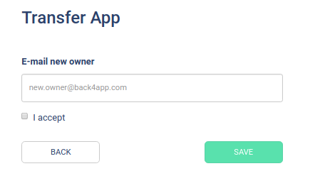 After clicking on this option, you will transfer the possession of the app to another person, to do this you click in the blank and write the e-mail of this person.after write the e-mail you click in the box bellow the blank to accept the transfer